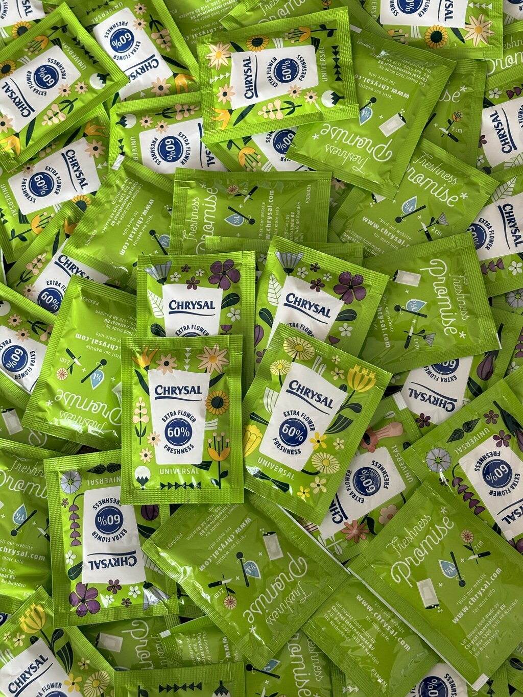 Sobres de comida para flor para el completo desarrollo de todas las flores cortadas, provee todos los nutrientes necesarios para un arreglo que contenga una mezcla de flores de variedad, ya que incrementa la vida en el florero hasta un 60% comparado con el uso de agua sola. Un sobre de 5grs, rinde hasta medio litro de agua.